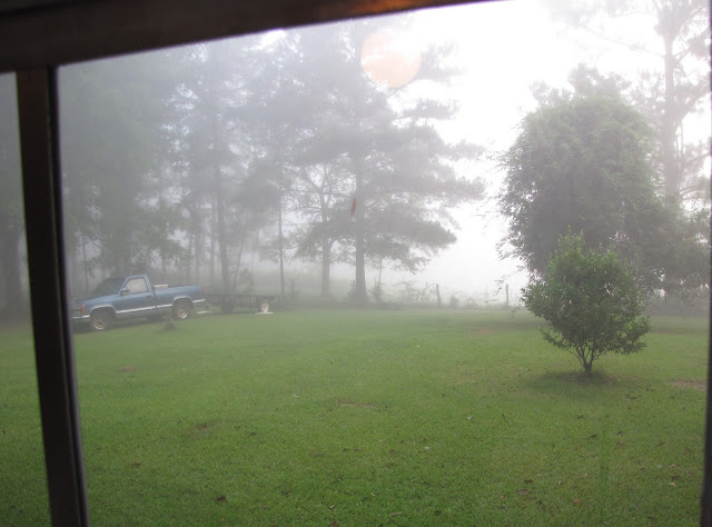 I woke up to a rather beautiful sight this morning or to me it is beautiful...a Foggy Mississippi morn. 1 sure sigh that Fall is in the air. This is the kind of morning my Momma would call a pea soup morning. The fog is so thick you could cut it with a knife. Sadly it is also a very dangerous kind of morning especially for the kids headed to Co-Lin, cause they don't realize yet how dangerous it can be, you never know what the fog is hiding untill you've run into it. And they just don't slow down, can see but still go wide open.